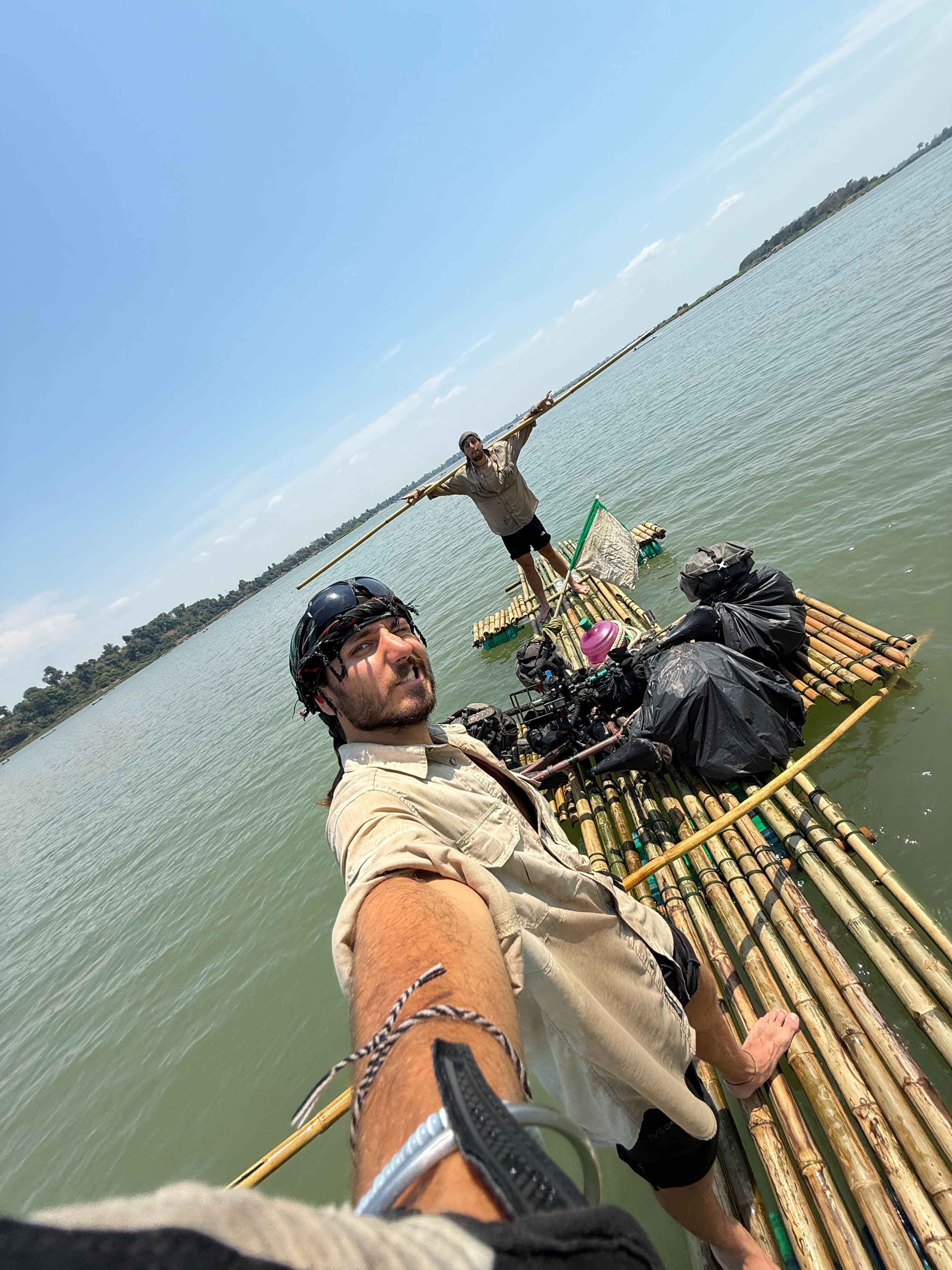 Au Laos, nous nous sommes arrêtés une semaine pour construire un radeau avec des cannes de bambou et des bouteilles d'eau pour traverser le Mékong.